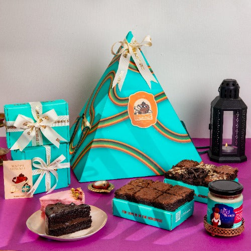 1.Mini Classic Brownie Box 1 no (Wt - 150 G) 2.Mini Assorted Brownie Box 1 no (Classic, Nutty, Bulletman, Blondie, Overloaded Brownie) (Wt - 175 G) 3.Chocolate Pastry 1 no (Wt - 120 G) 4.Indian Flavoured Desserts Rose Pistachio Pastry 1 no / Chocolate Pastry For Eggless Shelf Life - 7 days | (Wt - 120 G) 5.Red Velvet Jar 1 no Shelf Life - 6 days | Wt - 160 G 6. Diya 7. Diwali Gift Card is included in our premium packing