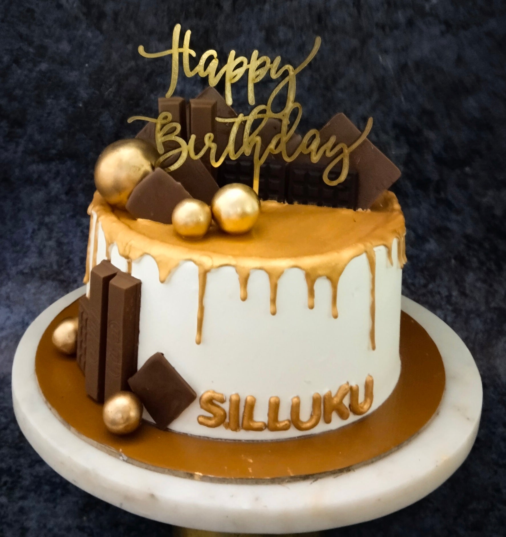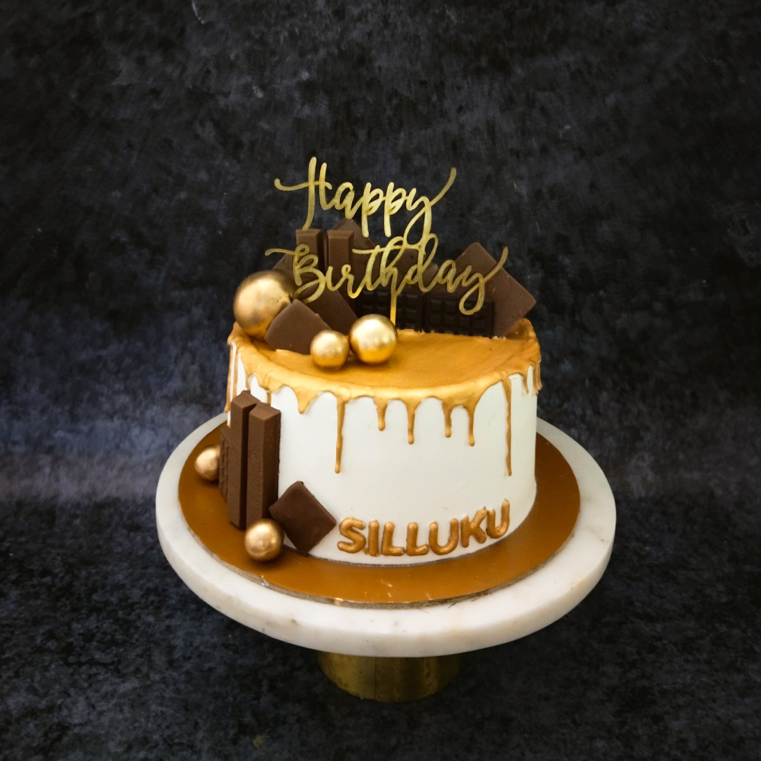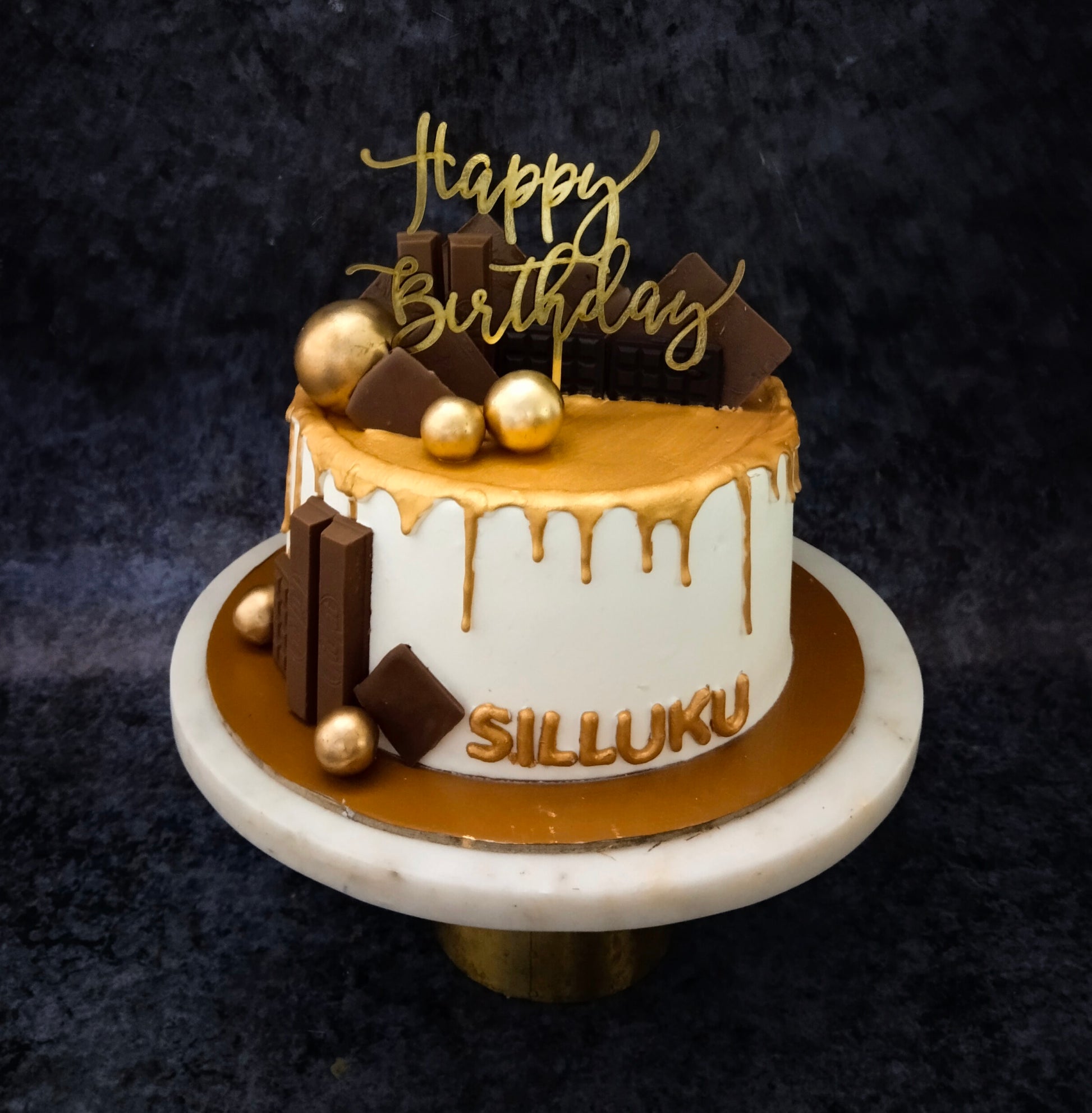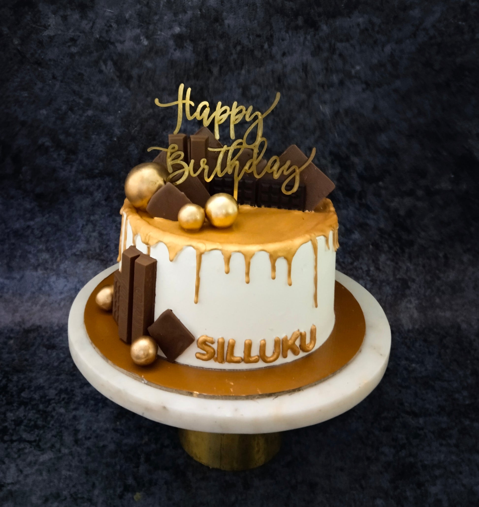 This cake is made special with golden drips of chocolate on the side and top, creating a luxurious and decadent finish.